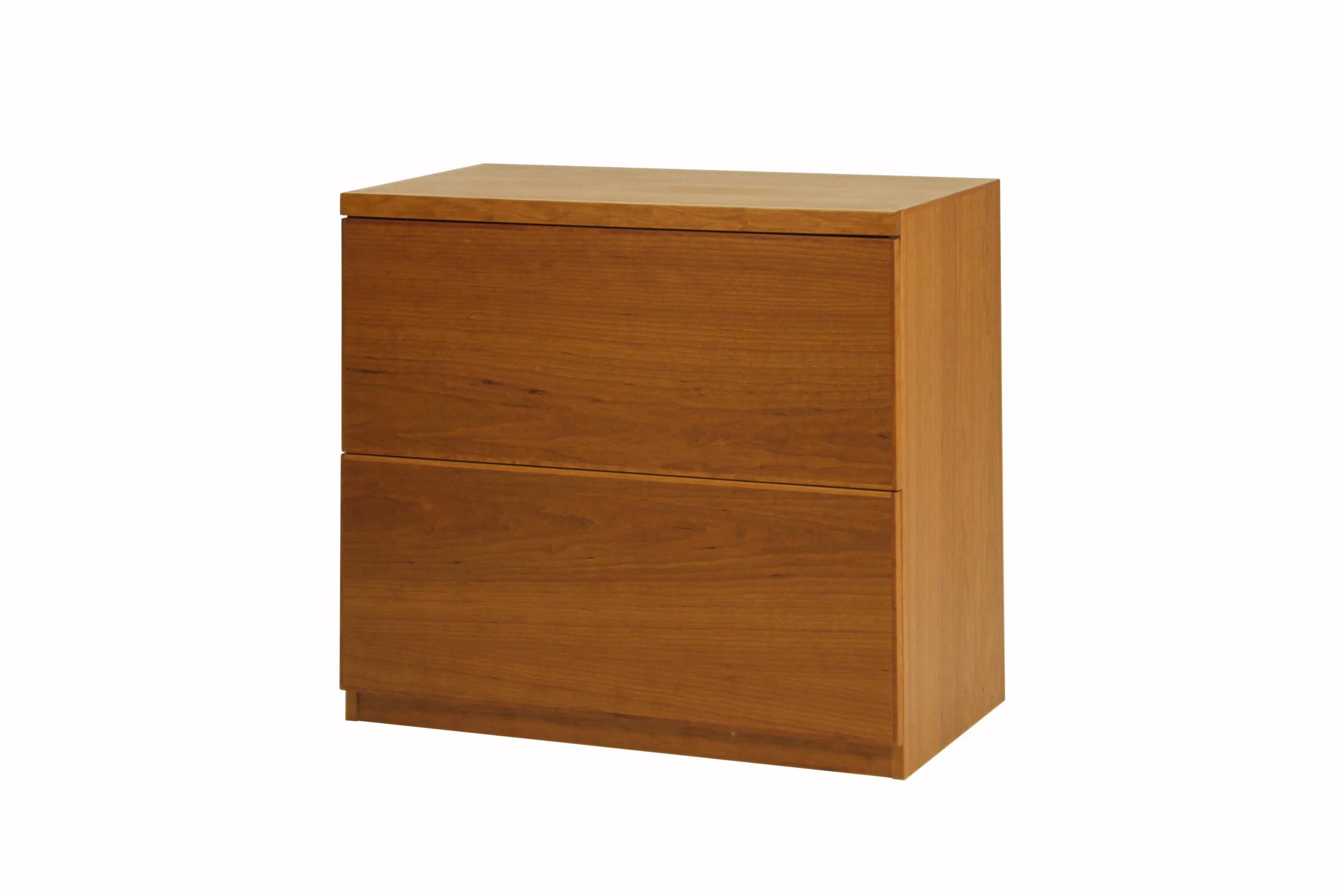 With two lateral file drawers. Files run from left to right. Drawers come with rails for hanging files. With self-closing drawer slides to ensure drawers close softly and with minimal effort. Finger-pulls are grooved into the sides of each drawer to facilitate easy, hardware-less opening of drawer. Made in Chicago from a combination of solid hardwood and high-grade plywood with solid edge-banding. Hand-finished with three coats of Danish oil and one coat of wax. Drawers are configured for regular files by default; drawers can be configured for legal files if given advanced notice. Stocked in cherry (as shown) and made-to-order in custom dimensions, wood species, and finishes.